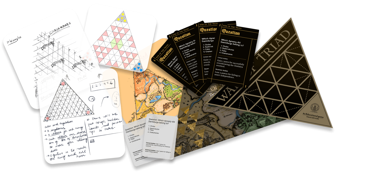 War of Triad is a Strategic 3-Player Board Game that brings history to life, inspired by the 7th grade NCERT textbook "Kings and Kingdoms." Designed through numerous iterations and rigorous playtesting, the game merges strategy with education, offering players an engaging way to explore historical concepts.